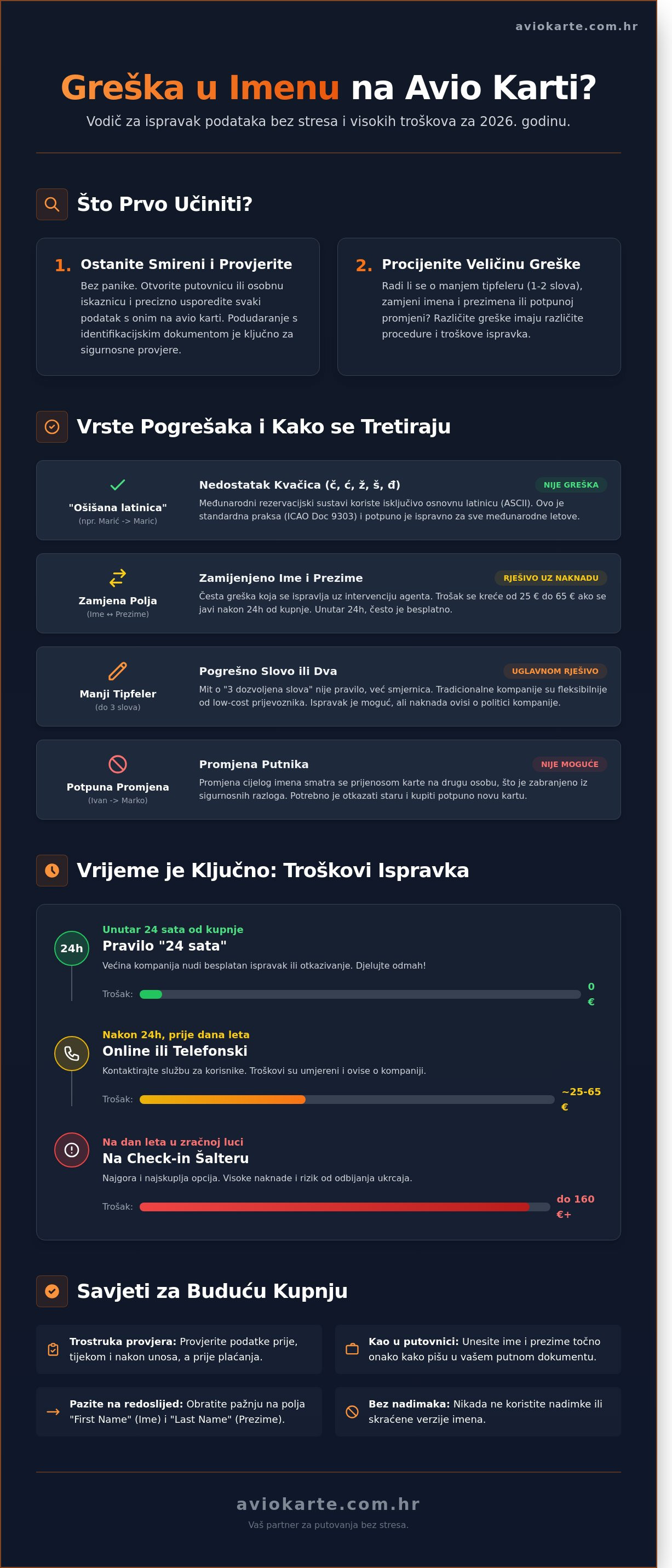 U ovom vodiču za 2026. godinu saznat ćete točne korake kako reagirati čim primijetite pogrešku i kako je ispraviti uz minimalne troškove. Naš cilj je da na putovanje krenete potpuno mirni, bez straha od komplikacija pri ukrcaju. Provest ćemo vas kroz pravila najvećih europskih prijevoznika, objasniti vrijedi li i dalje famozno pravilo o tri dopuštena kriva slova te vam pokazati kako sve riješiti u samo nekoliko klikova. Pripremite se za let bez stresa uz provjerene informacije naših iskusnih putničkih savjetnika koji razumiju vaše potrebe.