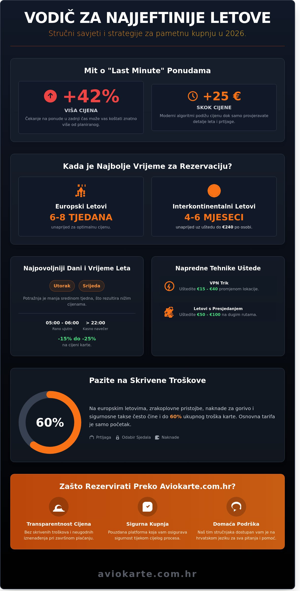 Last-minute ponude u 2026. godini postale su rizična strategija. Low-cost prijevoznici popunjavaju zadnja mjesta po premium cijenama jer znaju da poslovni putnici moraju stići na odredište bez obzira na trošak. Ako rezervirate let manje od 14 dana prije polaska, očekujte cijene veće za minimalno 40%. Kod planiranja unaprijed, korisno je poznavati svoja prava zračnih putnika u slučaju otkazivanja ili promjena u redu letenja, što je česta pojava kod letova kupljenih mjesecima ranije.