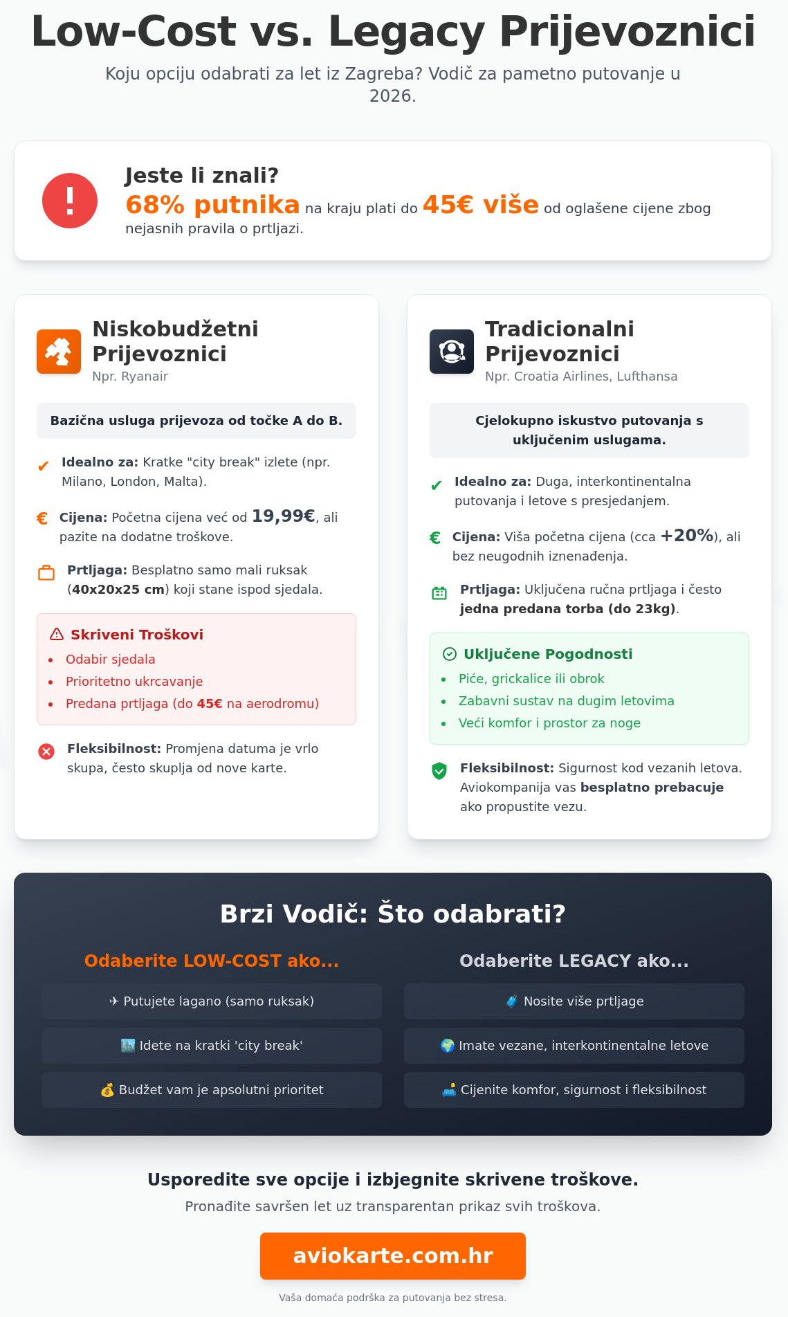 - Naučite prepoznati ključne razlike između niskobudžetnih i legacy prijevoznika kako biste izbjegli skrivene troškove prtljage i dodatnih usluga.