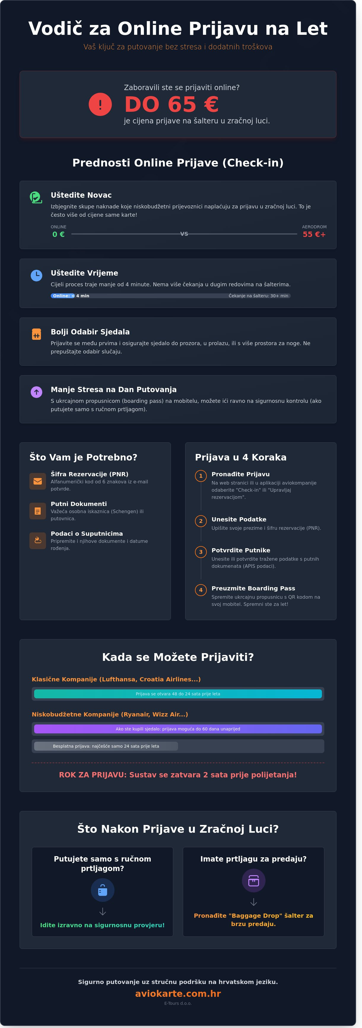 - Klasični prijevoznici (Croatia Airlines, Lufthansa, Turkish Airlines): Prijava je najčešće moguća od 48 ili 24 sata pa sve do 1-2 sata prije polijetanja.