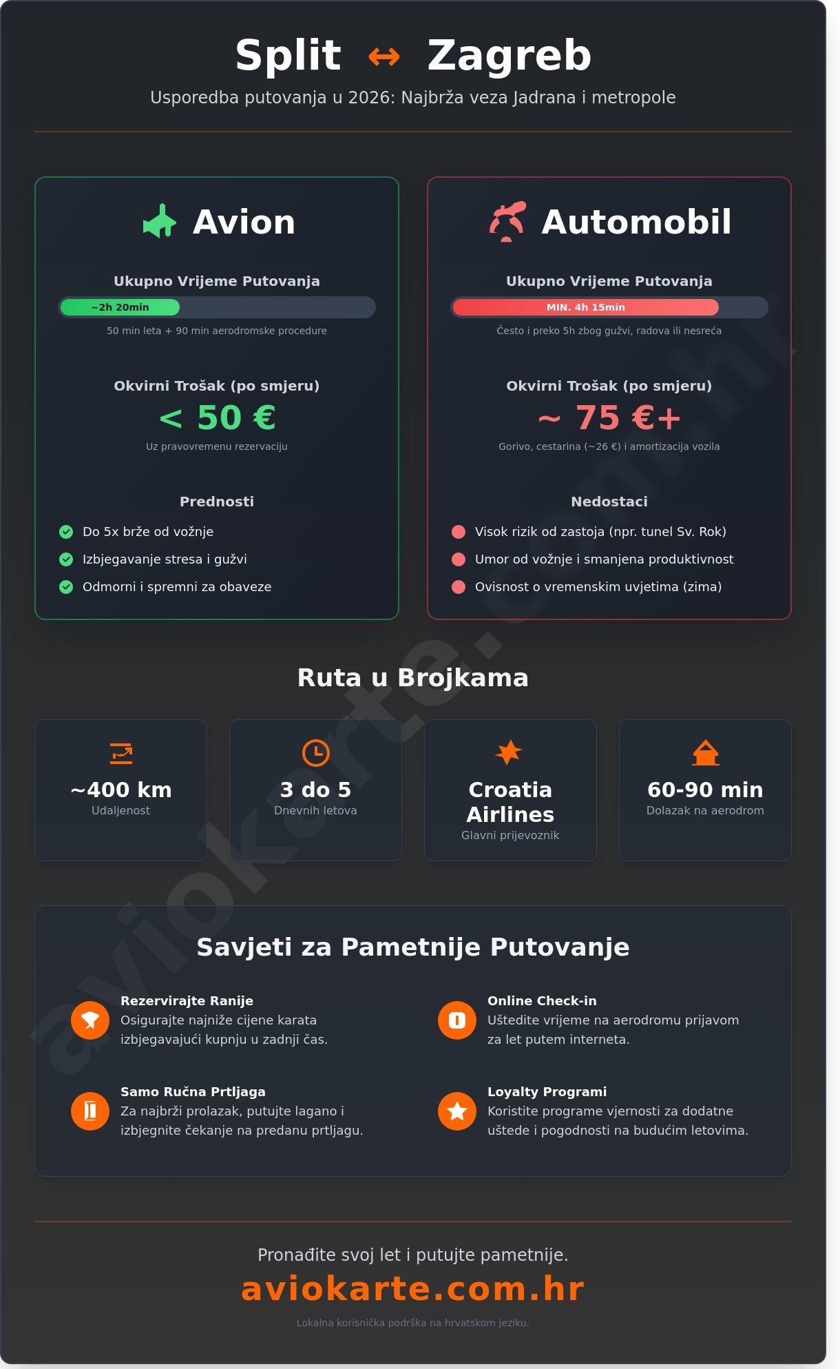 Putovanje na relaciji Split - Zagreb u 2026. godini ostaje uvjerljivo najbrža opcija za sve putnike koji cijene svoje vrijeme. Prosječno trajanje leta od 45 minuta eliminira sate provedene na autocesti, dok direktna poveznica zračnih luka Resnik i Franjo Tuđman osigurava maksimalnu logističku jednostavnost. Kada se zbroje troškovi goriva i cestarine, koji za ovaj put često iznose više od 70 €, zrakoplovne karte postaju iznimno konkurentna i financijski isplativa alternativa. Naša tražilica u realnom vremenu analizira sve dostupne tarife kako biste dobili najtočnije informacije o trenutnim cijenama i slobodnim mjestima.